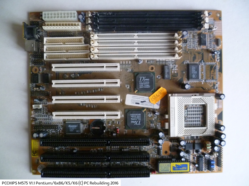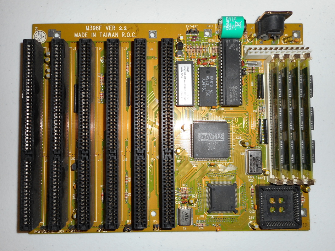 This is one of the PC Chips boards that have the fake cache chips, as can be seen in the top-right corner of the image above - this means that unless you have a COASt module installed in the slot, the motherboard has no L2 cache. Either a 256 KB or 512 KB module of asynchronous SRAM or a 256 KB module of pipeline-burst SRAM can be installed. The board can support a cacheable area up to 64 KB of cache.