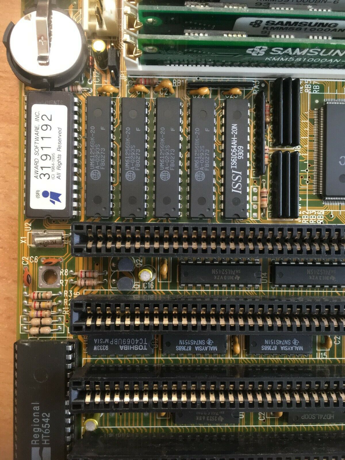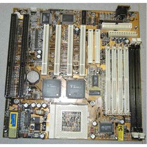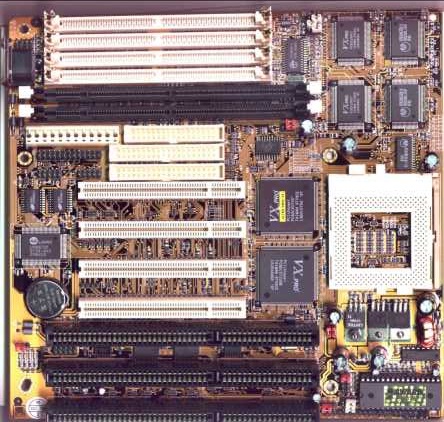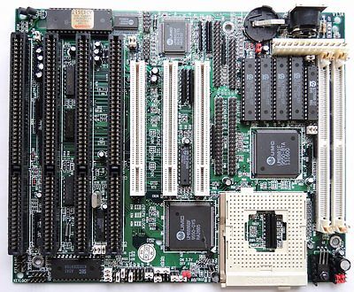 Despite the fact this board has the highly publicised fake cache chips (see top-right corner), it's still an interesting one in that it has a combination of ISA, VESA Local Bus, and PCI slots. There is an argument that combining VLB and PCI on the same board is a bad design choice due to the differences in frequency that are supported between these two standards. Some have noticed the presence of VLB slots on boards like this slows down the PCI slots to avoid incompatibility.