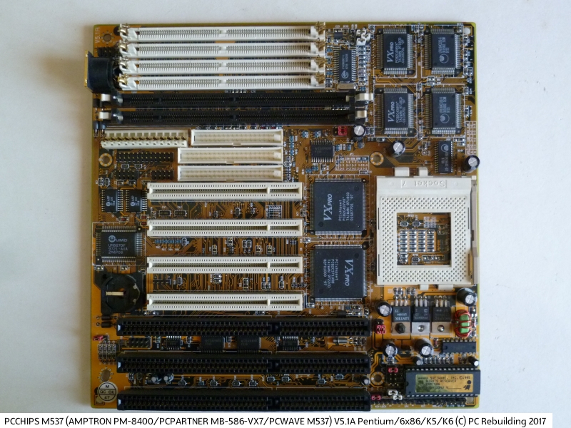 Almost everything else about the M537DMA33 is identical to the M537 (see above). The M537DMA33 was also sold as Sybercom MB537DMA(VXpro+), Ability MB-586VX7+, Protac MB5370+, Eurone EM-5800V+ v5.2A, Matsonic MS-5120, Aristo AM-538VXPLUS(?), and Pine PT7504-AB. They are identical in every way to the PCChips M537DMA33.