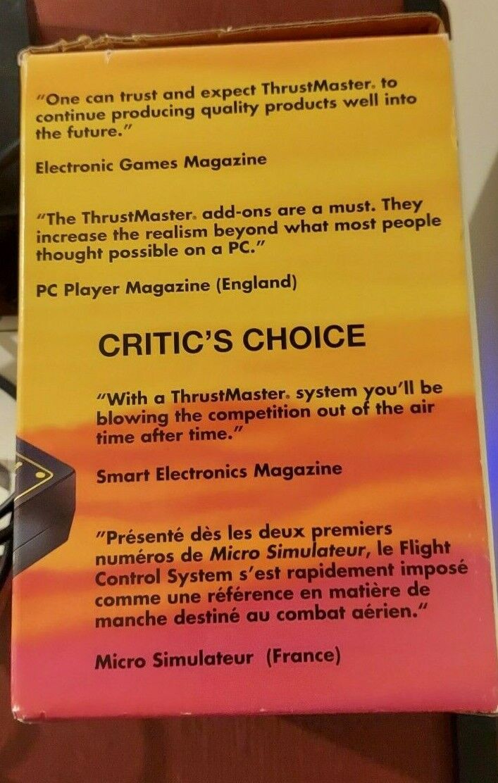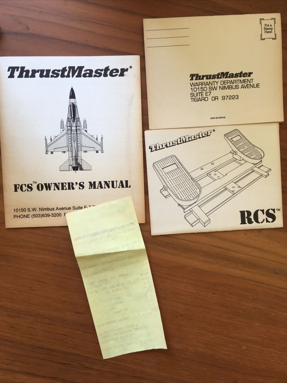 In 1992, ThrustMaster released the Weapons Control System, often abbreviated to WCS. This complemented the Flight Control System (FCS) perfectly, and provided both a throttle control and weapons control for the other hand, all on one device.