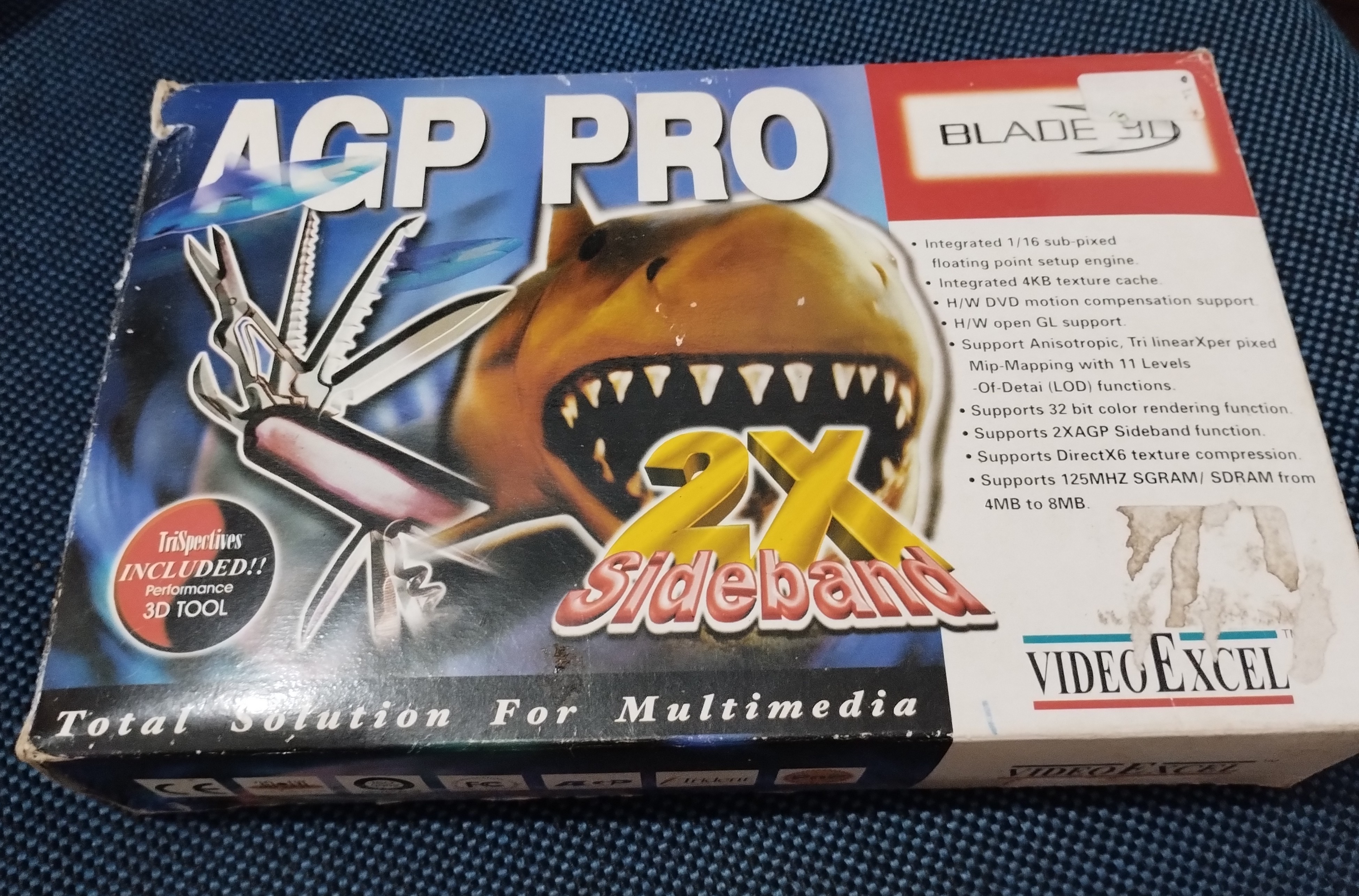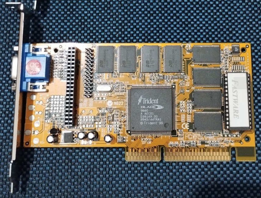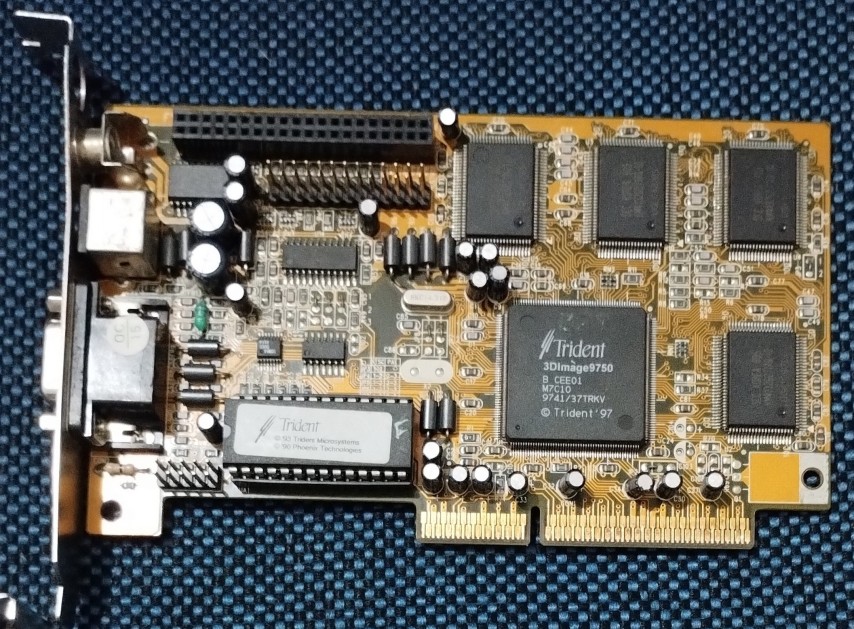 A cost-effective (at the time) AGP graphics card with very limited 3D acceleration capability. It retailed for around half what a standard 3D AGP graphics accelerator would have cost back in 1998. Cards based on this Trident chipset did usually also have a TV-out feature able to display 640 x 480 on a standard television. With the full 4 MB of RAM installed, screen resolutions of up to 1600 x 1200 at 24-bit colour depths were possible with refresh rates from 60 Hz up to 200 Hz.