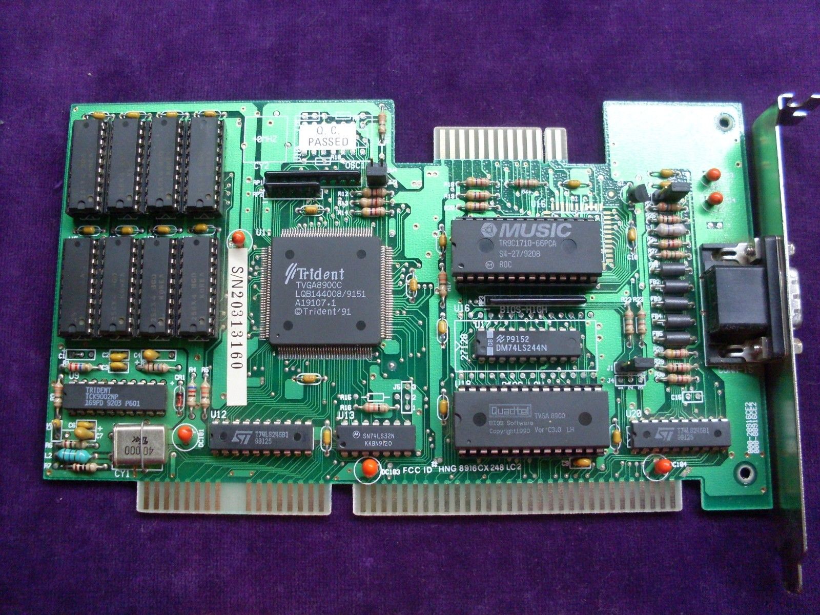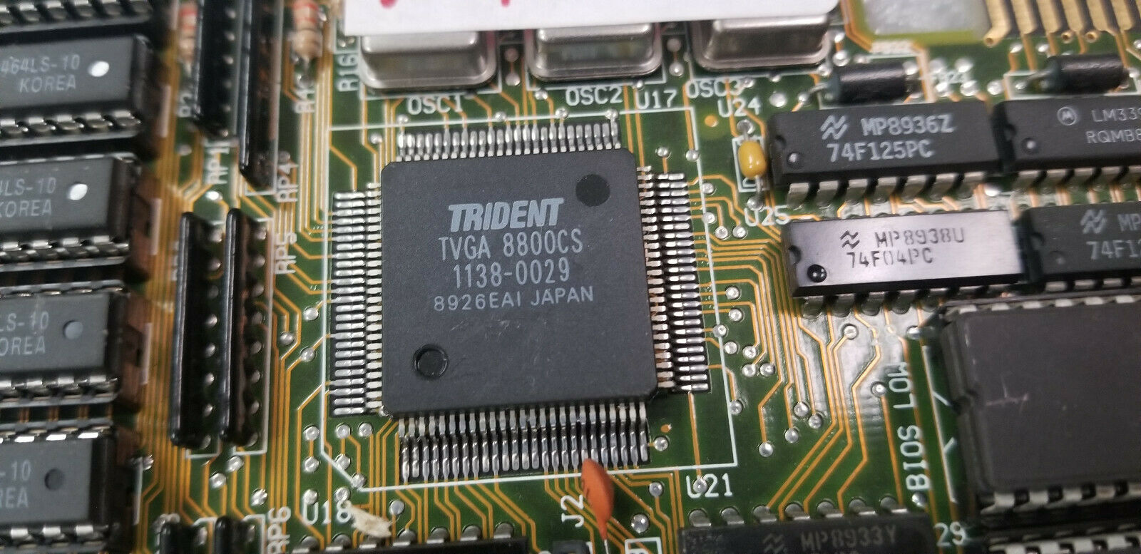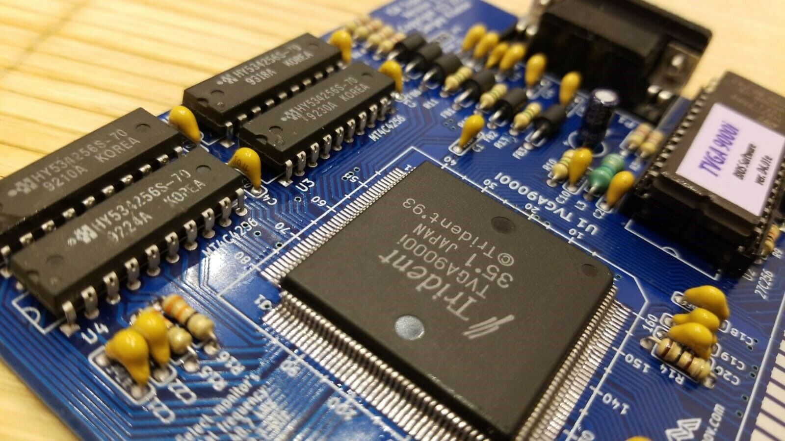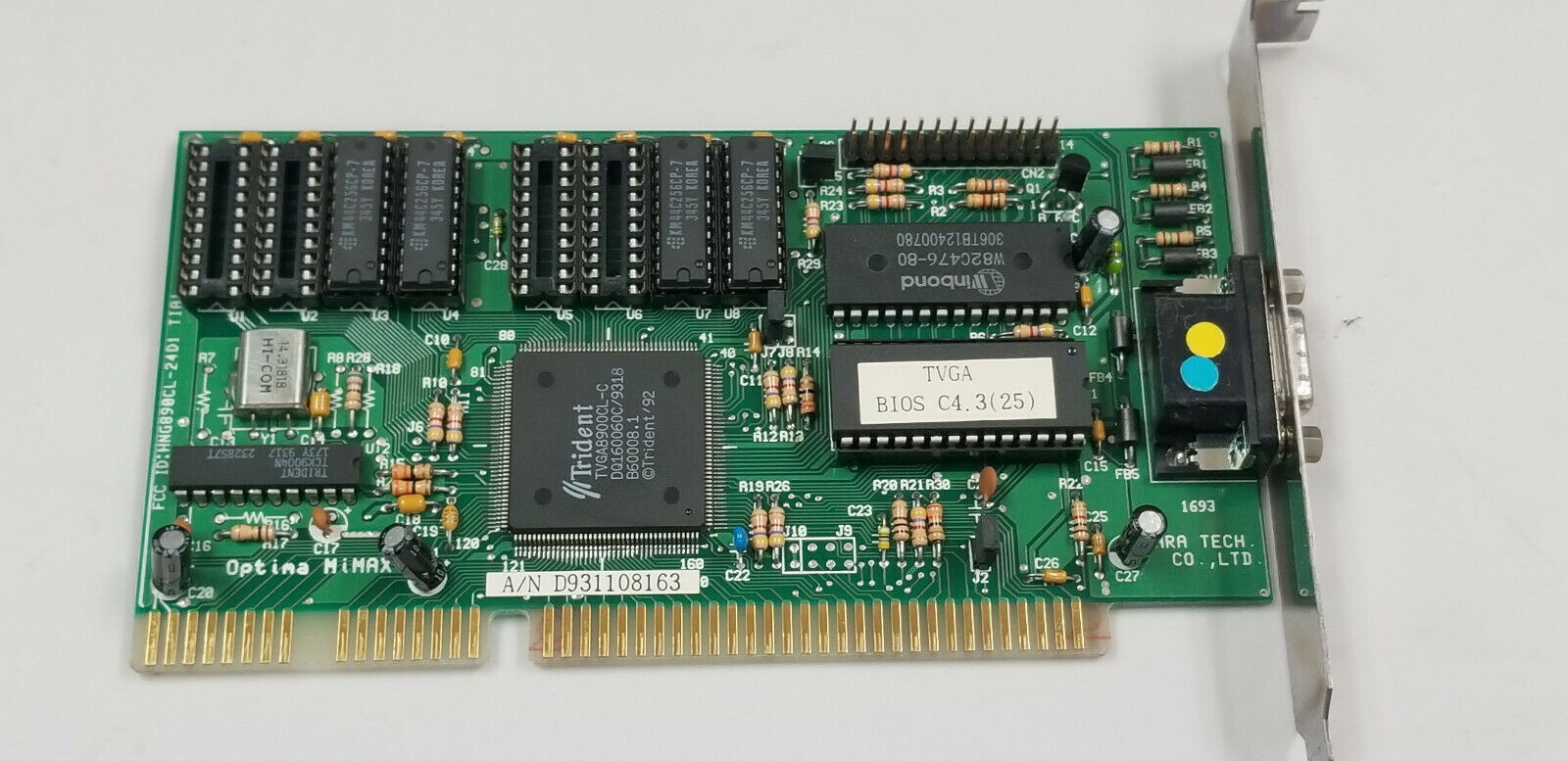 The Trident TVGA8900D Super VGA Controller was the successor to the TVGA8900CL and TVGA8900C VGA chipset, with the key improvement being faster performance through zero-wait state direct memory writes on the ISA bus and a faster DRAM clock (48 MHz). It also added support for 1 MB of linear memory addressing (no more bank switching). It required just 3 support chips: TKD8001 TrueColor DAC/clock chip and two 256x4 DRAM chips.