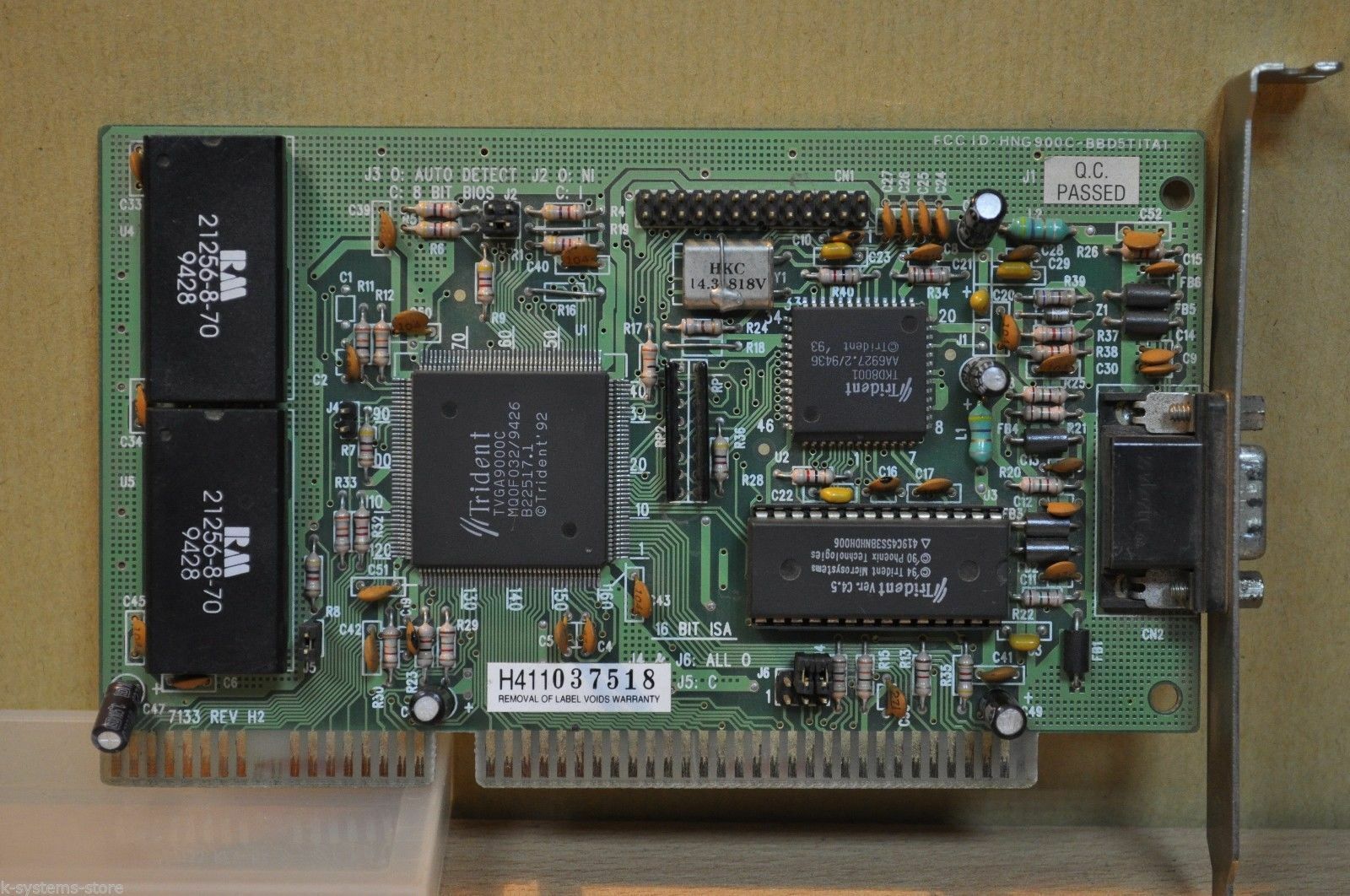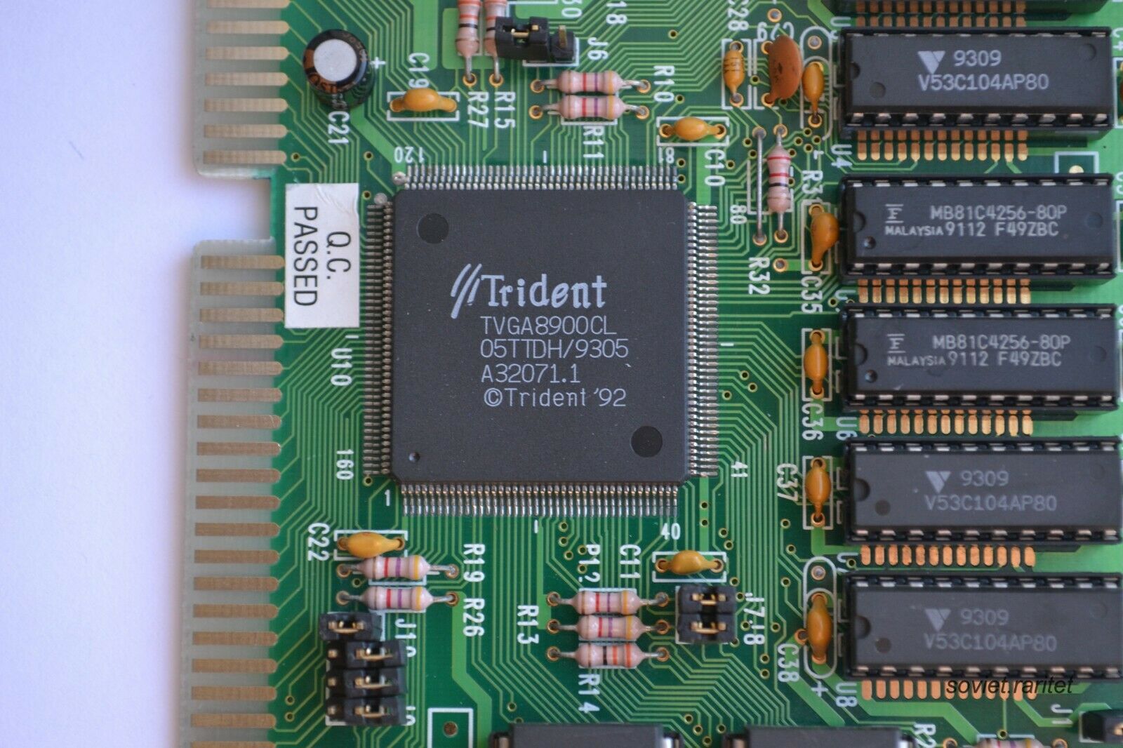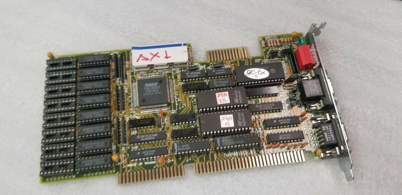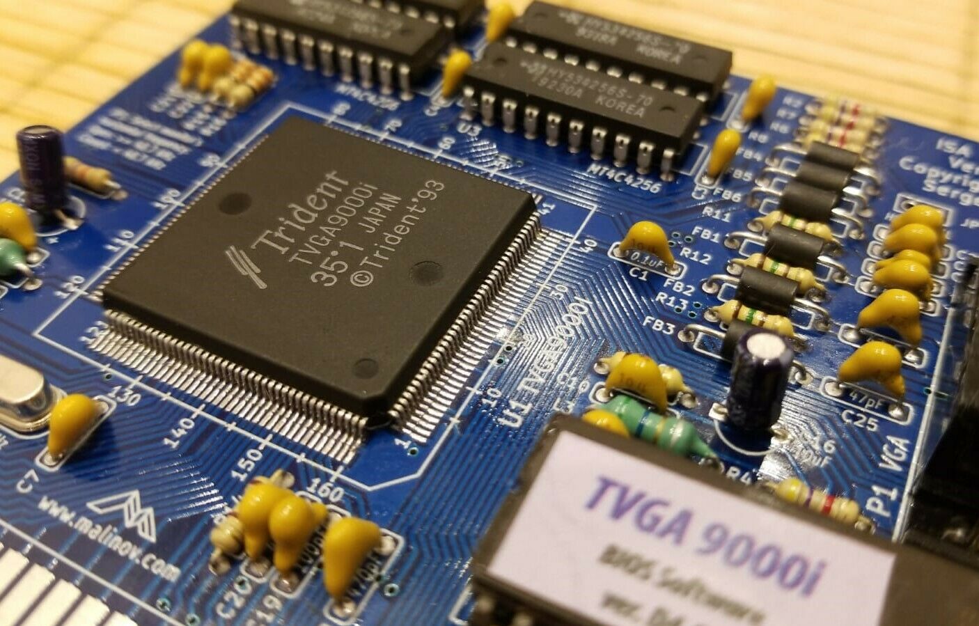 The Trident TVGA8900D Super VGA Controller was the successor to the TVGA8900CL and TVGA8900C VGA chipset, with the key improvement being faster performance through zero-wait state direct memory writes on the ISA bus and a faster DRAM clock (48 MHz). It also added support for 1 MB of linear memory addressing (no more bank switching). It required just 3 support chips: TKD8001 TrueColor DAC/clock chip and two 256x4 DRAM chips.