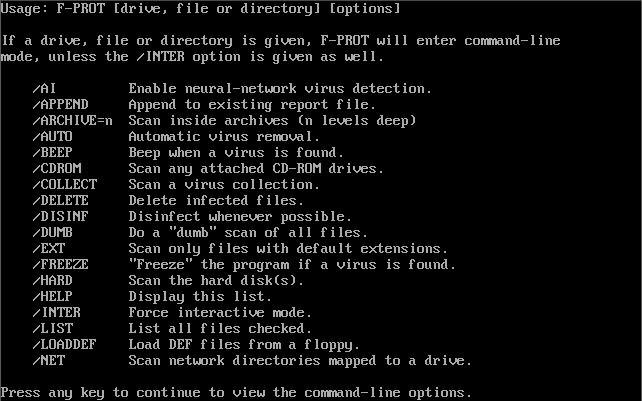 F-PROT.EXE is the scanner which can run either as a standalone DOS application or via command-line arguments.