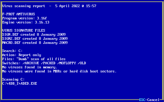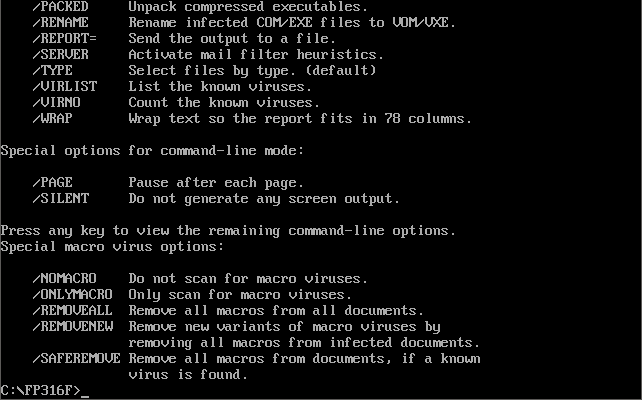 It can scan within archives (ARJ / CAB / LZH / RAR / ZIP), many packed executables and emails. Running it today requires the use of the /OLD command-line argument to ignore the fact that all .DEF (virus definition) files are out of date.