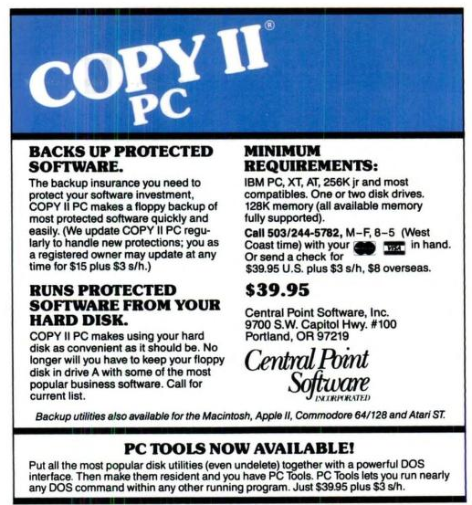 Copy II Plus, written by Central Point Software and released in 1981, was one of the first copying tools that, when coupled with a special expansion card, the Option Board, could also duplicate some key disks. Copy II Plus was followed shortly after by Copy II PC, in 1982. The reception to these products and their ability to eliminate copy protection was met with horror - so much so that Central Point Software were driven out of the Software Publishers Association and the Wall Street Journal wrote a feature story on their president, Michael Brown, calling him "a hero to some, a villain to others." A Supreme Court case in 1984 settled the question of whether such software was "contributing to copyright infringement" declared that "as long as a product had a substantial noninfringing use, there was no contributory effect." The court also ruled that since copy-protection liberators (such as Central Point) give consumers the right to make archival copies which they are entitled to do under section 117 of the copyright law, the programs do have a substantial noninfringing use.