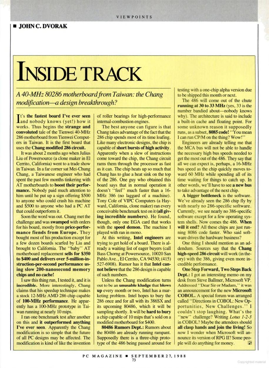 Oh, and you might have heard of the "Chang Modification" from late 1988 when a Taiwan-based company called Tienwei Computers declared they had produced a 40 MHz 80286 motherboard. The media saw it running benchmarks, and it all looked pretty legitimate - the world was astounded. Soon after they discovered it was all smoke and mirrors - he "gamed" the computer clock in such a way that the Landmark Speed Test gauge calculated performance incorrectly, making a system look about four times more powerful than it really was. This was achieved by making the DOS timer run slower, so effectively what is measured as "10 seconds" by a benchmark program would in reality take 20 seconds if you halve the DOS timer frequency.