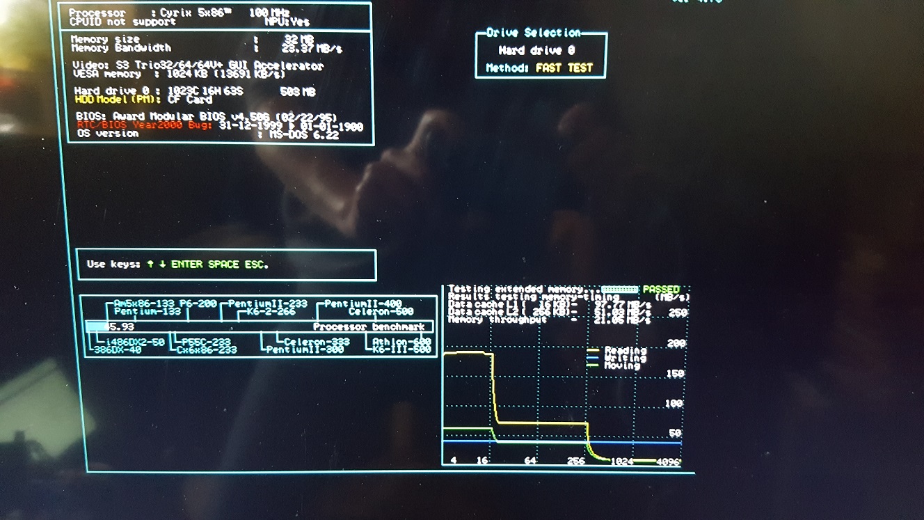 Others have had success in getting AMD 5x86 running on this board, but since these were not introduced until November 1995 and my BIOS is from February 1995, there is no way it would be directly supported, but let's see - I have an AMD 5x86 (X5)-133, which is the fastest 486-class CPU you can get giving performance in excess of a Pentium 75. I also have some other lower-voltage CPUs to try out.
