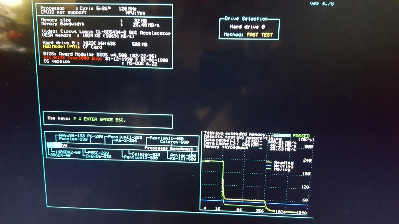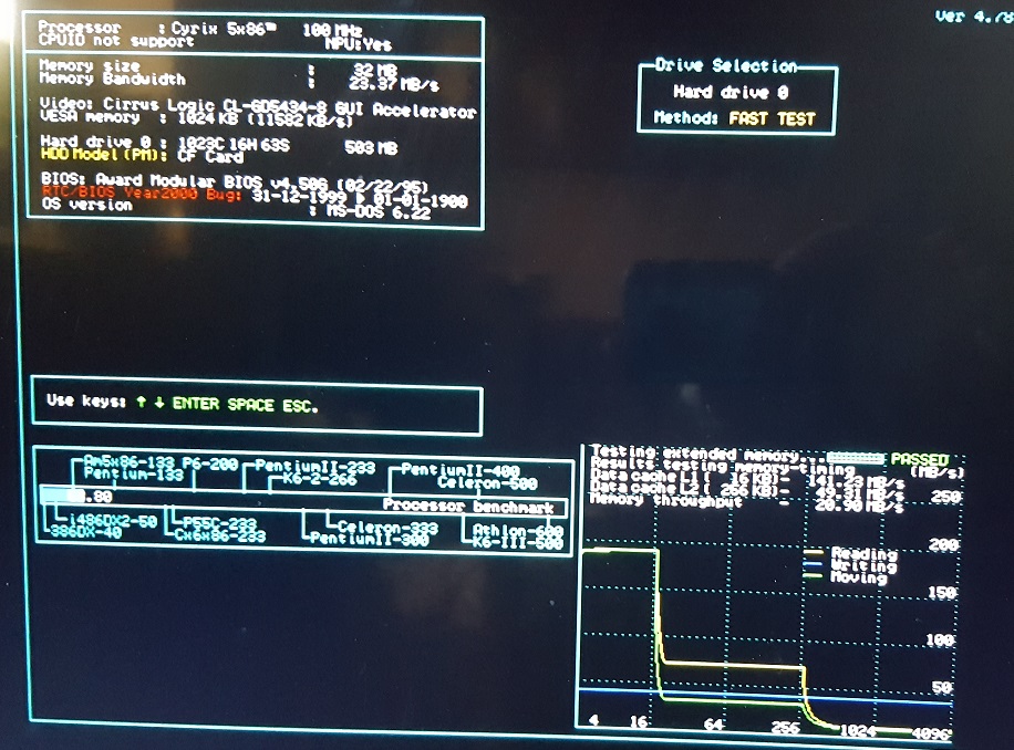 The motherboard's manual says it supports up to 100 MHz 80486DX4 CPU, so this came as no surprise. The BIOS detected it as a 'DX4-S' running at '100 MHz'. My CPU here is the Write-Through S-Spec version, so no WB option which would make it faster. I gathered a bunch of benchmarks with the Cirrus Logic CL-GD-5434 1 MB PCI, 256 KB of L2 cache (15ns) and 32 MB of main memory (60ns). SpeedSys v4.78 came in at a respectable 43.77. Norton SI 8.0 scored 198.4. The Doom timedemo got 42.8 fps.