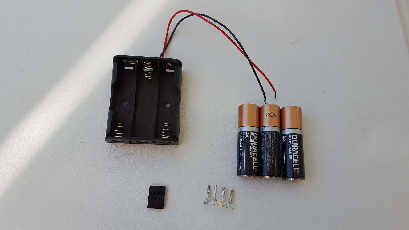 A 3-battery battery box , a 4-pin socket, 4 hollow pins and some batteries