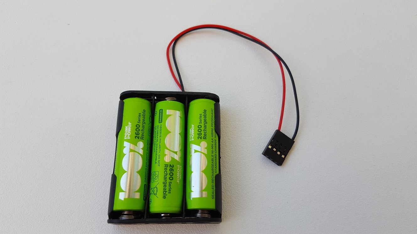 Testing the output voltage using three 1.2V rechargeable batteries (left),