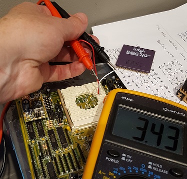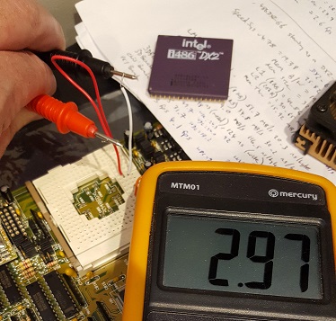 Socket 3 was the first socket to support both 5V and 3.3V CPUs. The AMD is an interesting one as it requires 3.45V. Since it's been a few years since I used this voltage regulator, I wanted to test that it is regulating the voltage correctly. To do so, I followed J. Steinbrink's excellent guide, which basically mimics what more modern 486-class CPUs do such as the 486DX4 and Am5x86 which have a VOLDET (voltage detect) pin. This causes compatible motherboards to auto-switch the voltage to 3.3V. Because my 486-VIP-IO2 has this daughterboard it definitely does *not* have any voltage auto-switching capability, but I can still check to confirm the board is feeding the CPU socket with the correct voltage when the daughterboard is connected: