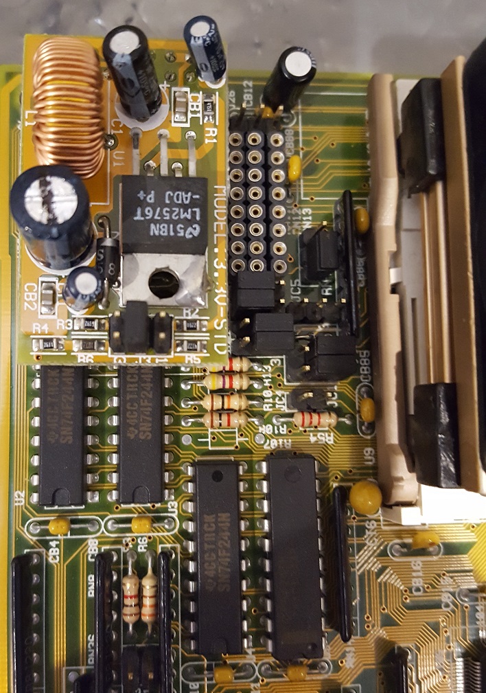 This connects into J2 on the motherboard, which is in the far corner near the CPU. Without the voltage regulator connected, the motherboard assumes you are using a 5 volt CPU. In this configuration J2 has both its end jumpers shorted. These both need to be removed before fitting the daughterboard.