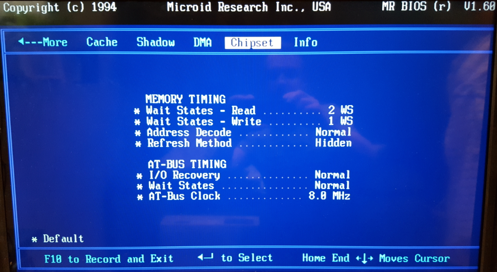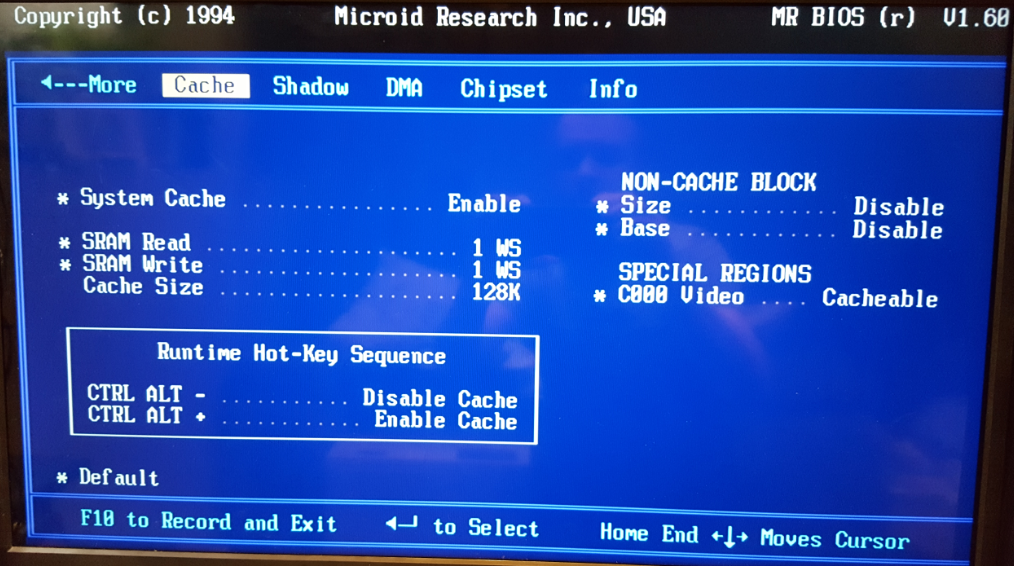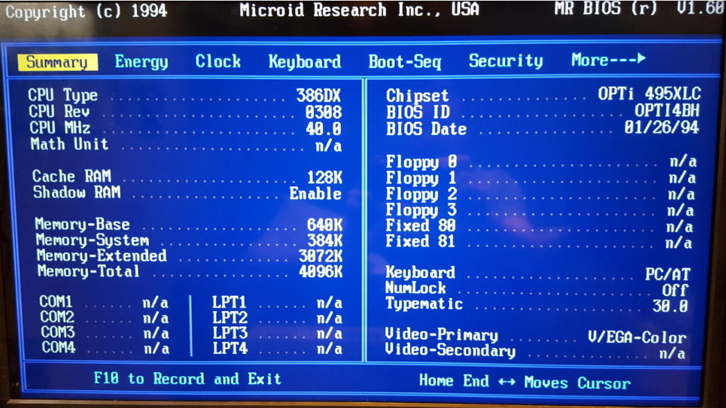 My motherboard however, uses an Mr BIOS (Microid Research) version 1.60 and dated 26th January 1994. Enthusiasts generally say Mr BIOS's are an upgrade on AMI or Award BIOS, offering better performance, more flexibility and options for overclocking. Getting into the BIOS is done by pressing ESC during the memory test, or once the system has started by pressing Ctrl-Alt-ESC - that's a very nice feature to have!