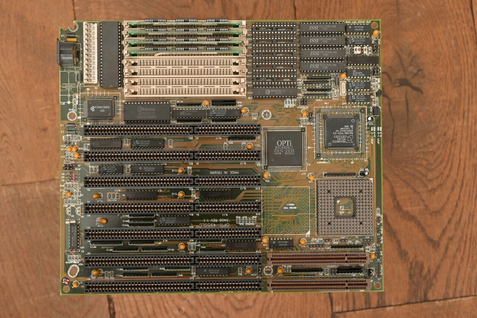 Date-wise, the most recent date stamp on the motherboards' chips is week 31 of 1994, which is the big OPTi chip. So this board was manufactured after 1st August 1994 - very late for a 386-based board.