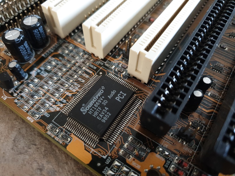 The M590 also comes with onboard sound - it's the same one found on their M571 motherboard. The chip marked 'SoundPro HT1869V+' is actually a C-Media CMI8330. It's pretty full-featured - Sound Blaster 16-compatible and even has "Sensaura HRTF 3D Audio" capabilities. The 3D Audio part of this is supposedly compatible with Aureal 3D and Direct Sound 3D, and the CMI8330 also supports S/PDIF digital audio out. Despite it also having "PCI" written on the chip, it's actually not PCI in any way - it uses the ISA bus which is arguably a good thing in my case, as I prefer to run pure DOS. You should never expect too much from any onboard motherboard audio - they're usually extremely noisy, given that they're surrounded by other chips on the motherboard as well as being sat right under the expansion cards.