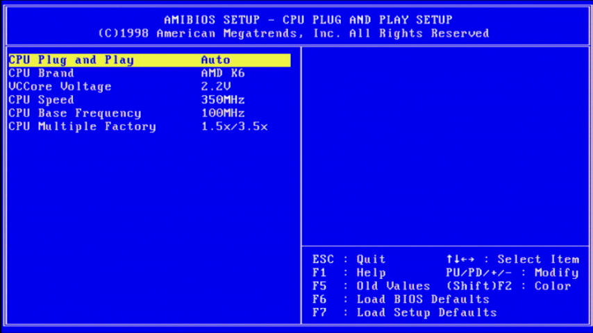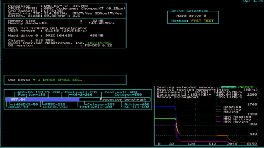 The jumperless configuration is such a luxury compared with all the Socket 3 motherboards I have where it takes a good while to configure, check and check again to be sure no damage will occur when I hit the power button. Without any other BIOS settings modifed I fired it up and noted that the CPU was being detected as an AMD K6-2 315 MHz. SpeedSys reported an external bus speed of 89.88 MHz with a 3.5x multiplier. Bear in mind the BIOS settings have been lost over time due to the CR2032 backup battery expiring.