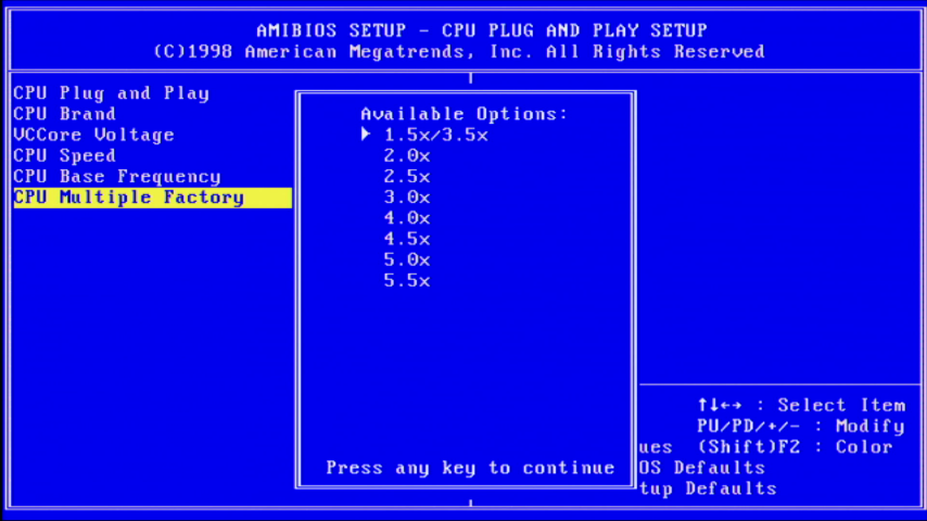 Interestingly, in the BIOS CPU Plug and Play Setup page, it doesn't actually refer to "AMD K6-2", only "AMD K6" - I guess it treats them the same; the CPU Speed options range from 166 MHz up to 500 MHz in 33 MHz increments (and several are repeated as they get to the same frequency using a different combination of FSB speed and multiplier). In "Auto" mode you can only select the eventual clock speed you want, but switching to "User Define" gives you access to adjust all the other options.