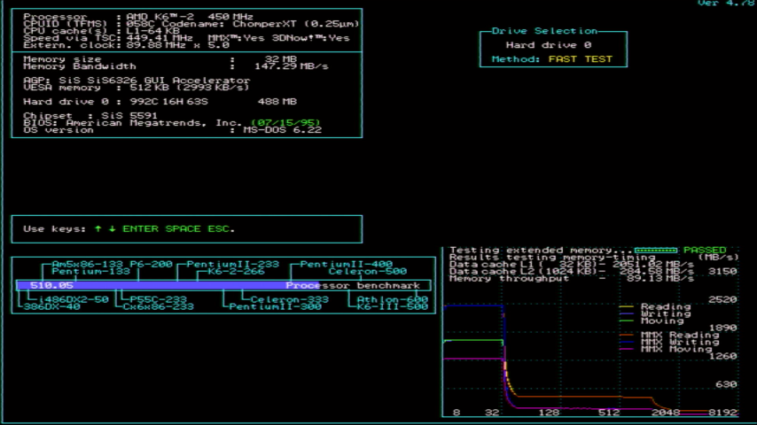 I went back to setting the FSB to 100 MHz and chose the 5.0x multiplier. The startup screen showed a 500 MHz K6-2, but in SpeedSys it again showed an FSB of 90 MHz resulting in a CPU speed of 450 MHz, and CacheChk with the CPU at 450 MHz on the 5x multiplier: