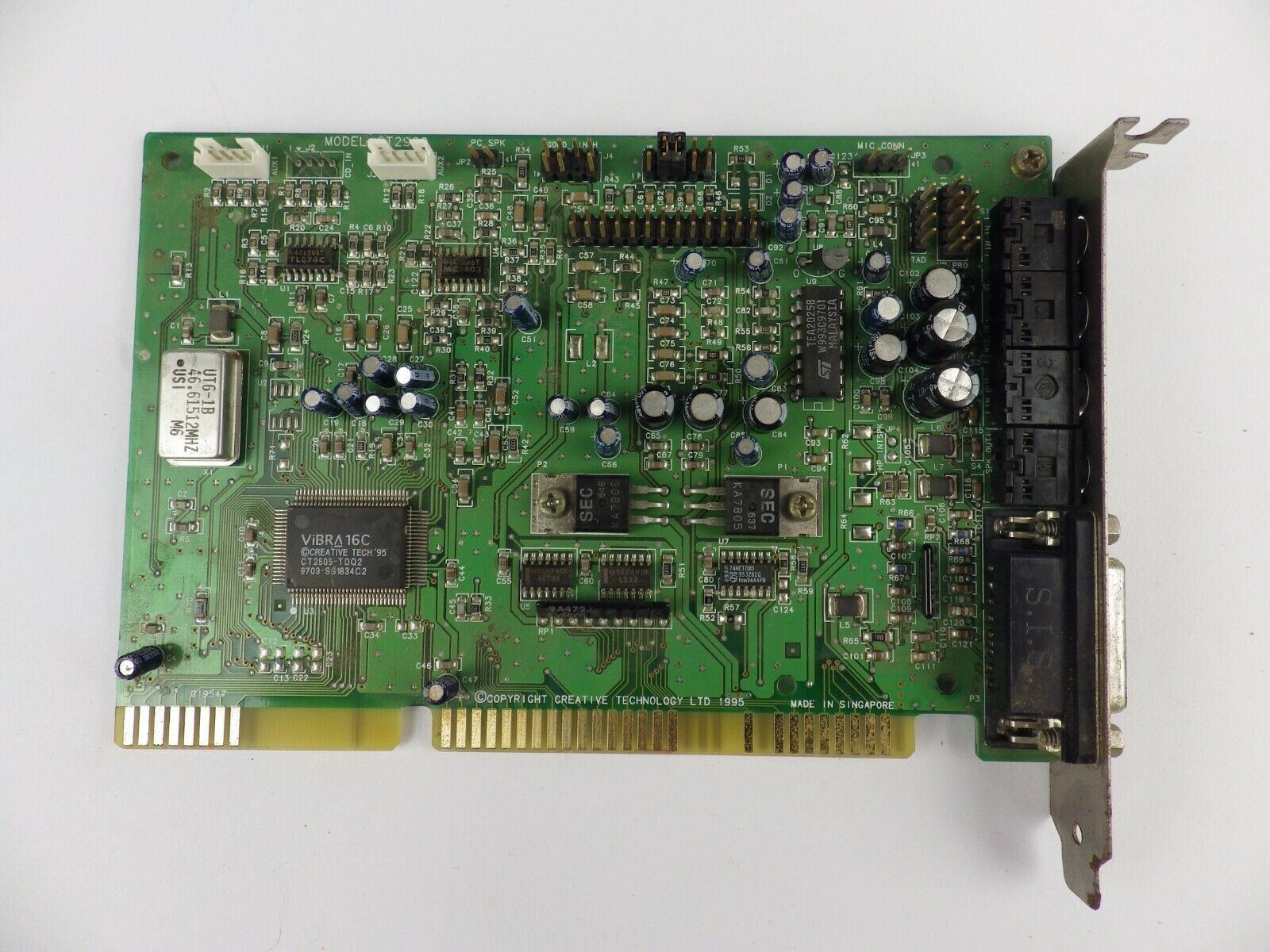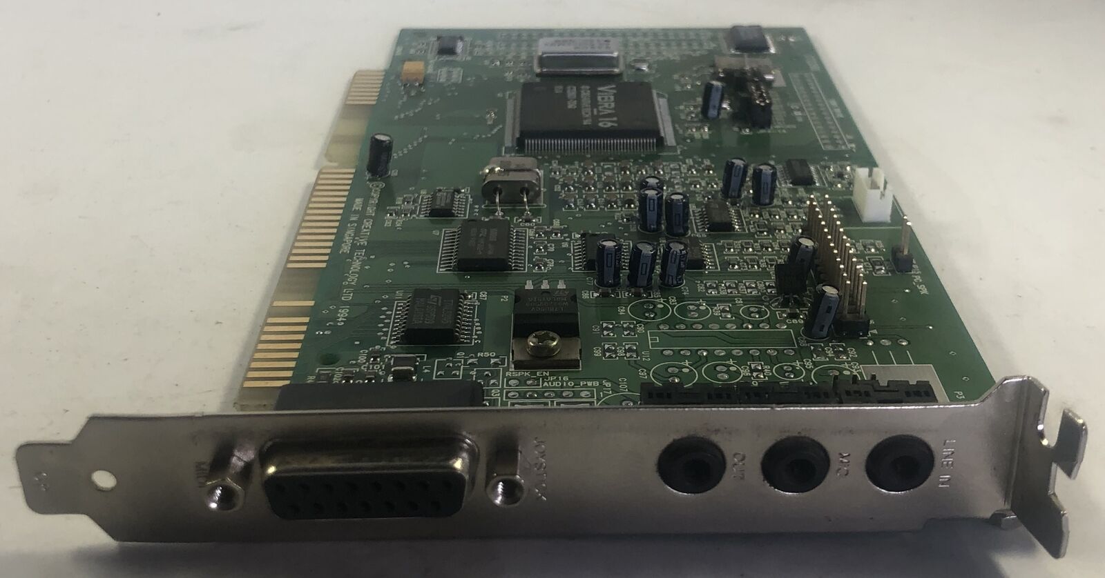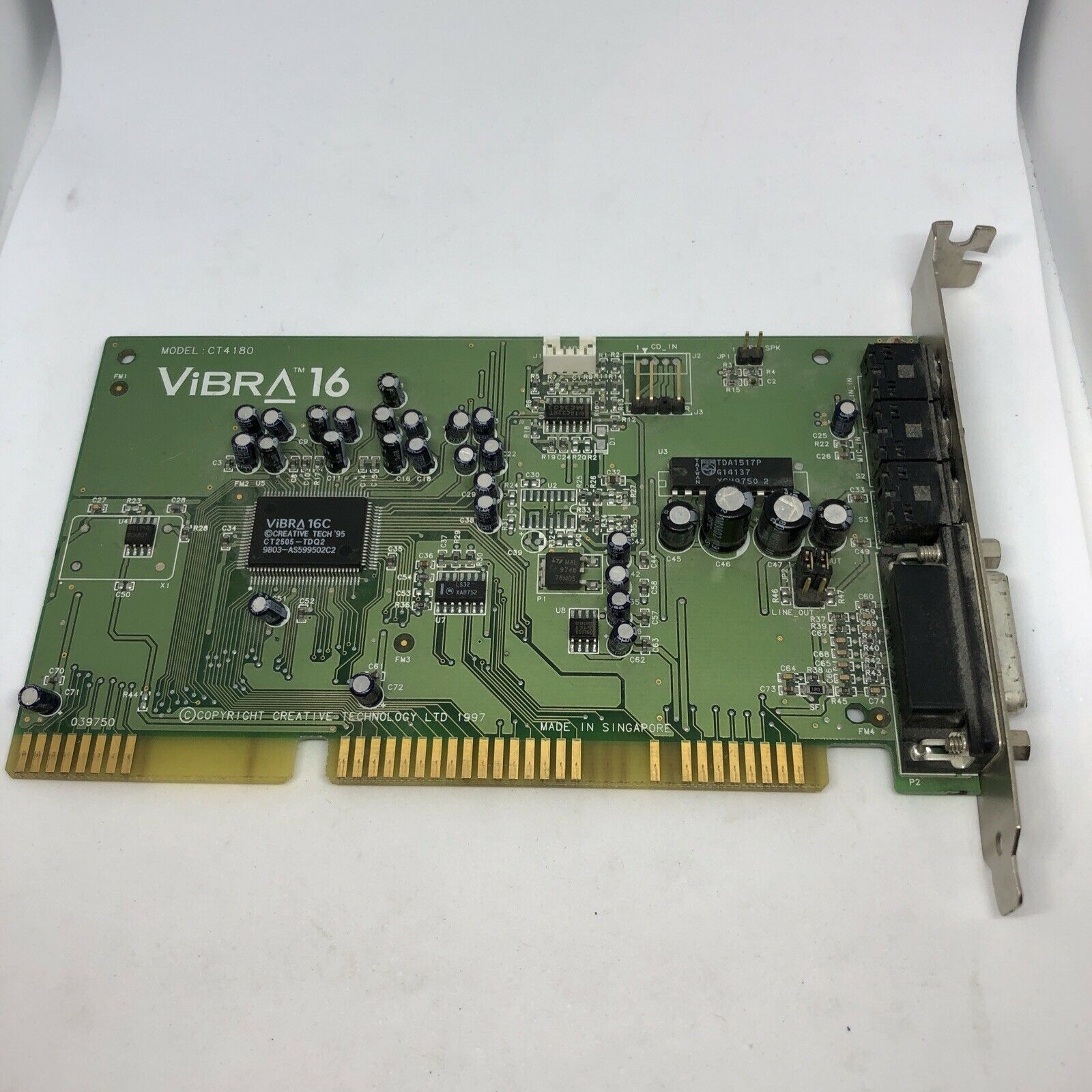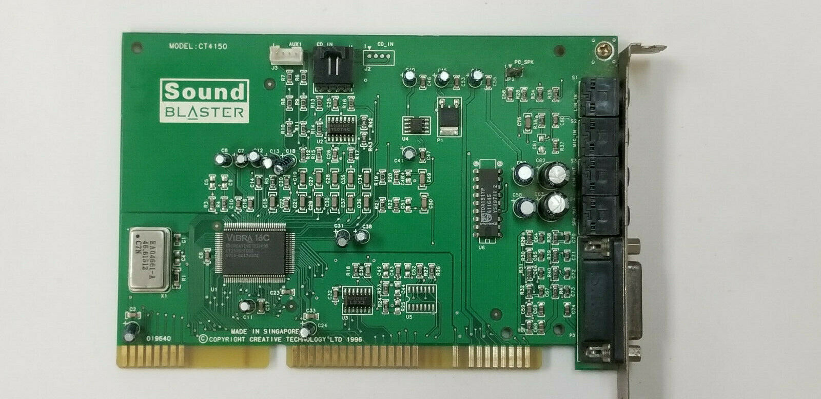 The CT4810, or to give it its full title, Sound Blaster ViBRA 128, was based around the Ensoniq AudioPCI chip, ES1373. ES1373 was a slightly updated version of their earlier ES1371, adding I2S In or S/PDIF Output (the blue Line-In and green Line-Out sockets double up to support these respectively).