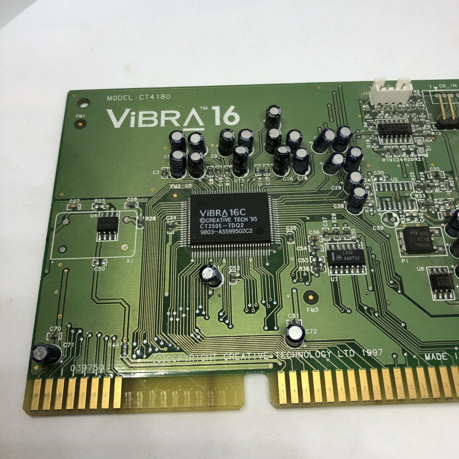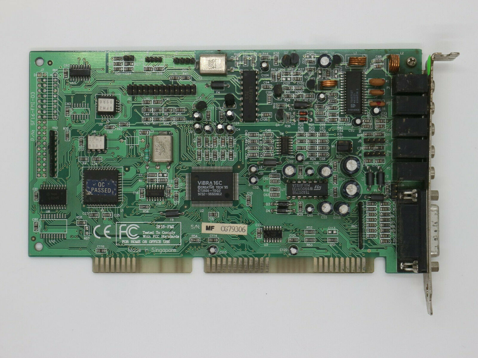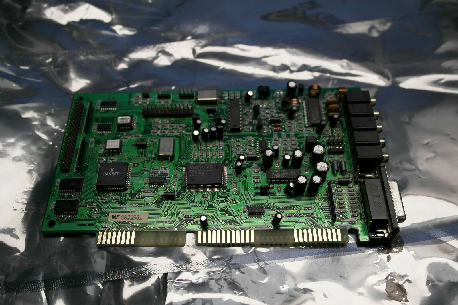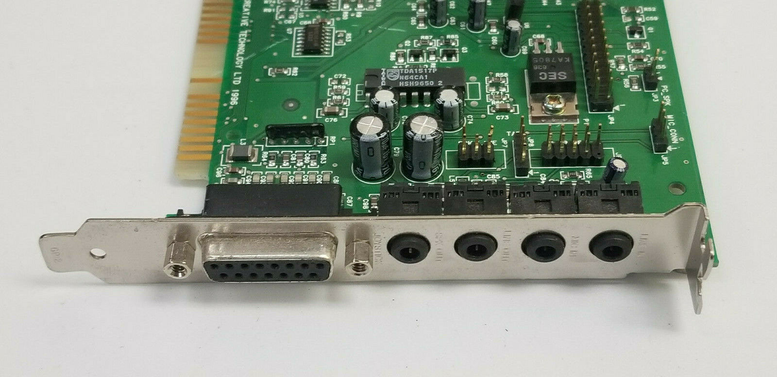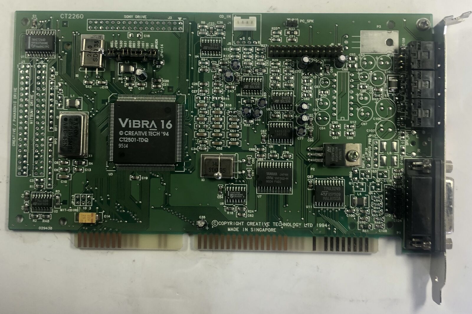 The CT4810, or to give it its full title, Sound Blaster ViBRA 128, was based around the Ensoniq AudioPCI chip, ES1373. ES1373 was a slightly updated version of their earlier ES1371, adding I2S In or S/PDIF Output (the blue Line-In and green Line-Out sockets double up to support these respectively).