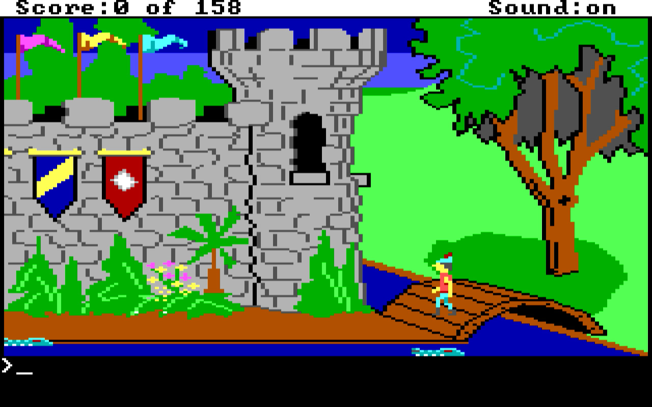AGI1 games support IBM PC and Tandy, and many will run on the IBM PCjr too - these all have built-in auto-detection of PC and Tandy/PCjr so the game could setup the graphics and sound modes properly based on the hardware found. Only the AGI0 graphics modes are supported by AGI1 - this means 320 x 200 resolution in either 4-colour CGA using the red/green/brown pallete, or 16-colour composite. Strictly-speaking, the horizontal resolution of all AGI games is 160 x 200, but the horizontal pixels are doubled-up, resulting in 320 pixels wide. This is evident when text is displayed on the screen, as it uses 40 columns of 8x8 text blocks. Sound capabilities were also the same as for AGI0: either the single tone PC speaker or the 3-voice sound of the Tandy/PCjr.