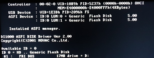 The two files you need are usbaspi.sys and di1000dd.sys. To get this working, simply copy these two files to C:\DOS for example, and add the following two lines to your config.sys file: