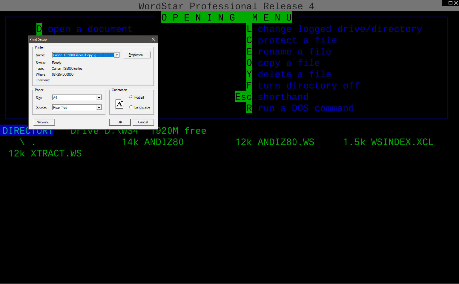 Unfortunately, I need to do some more research on how to properly support modern printers, as for me it just printed garbage after attempts with various printer types in WordStar - I tried Epson FX80, IBM Proprinter, or HPLJET. I downloaded vDOSPCLPS.zip and put those two files into my vDosPlus folder, and also downloaded and installed a program called Printfil, but I still could not get readable printed text from vDosPlus (Printfil's Print Preview screen showed the garbage chars). It's great news that vDosPlus came up with the Windows print dialog, which assures me this functionality is in place. I know it's simply lack of education on my part concerning PCL or PostScript (printing languages, basically), and will continue to work on it. I did successfully print a raw text file from the DOS command line by redirecting to LPT1:, so top marks for vDosPlus here!