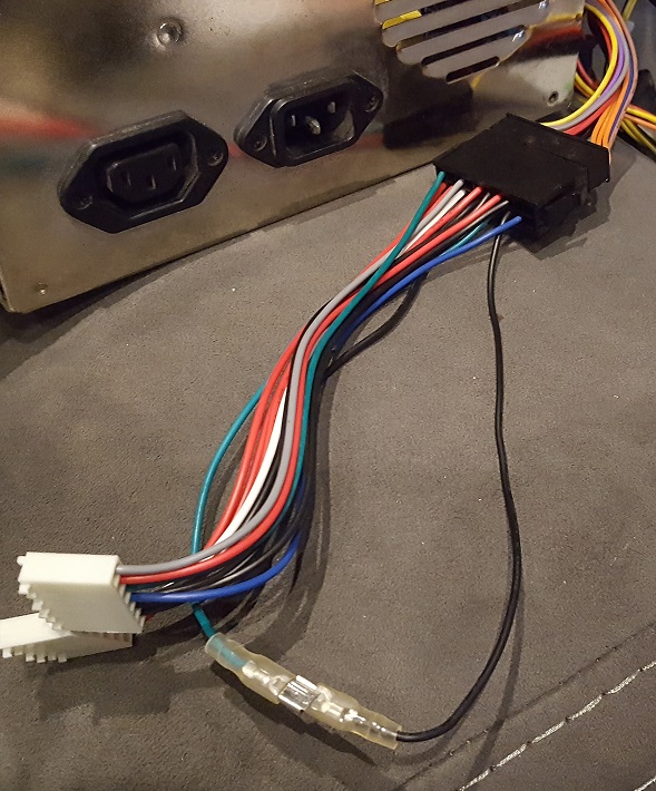 And there we have it, a fully functional XT power supply! But one thing remains to be done.... most ATX-to-AT converter cables come with a green and a black lead separate to the P8 and P9 connectors. These would ordinarily go to a low-voltage on/off switch at the front of your computer - since the on/off switch on this computer is on the side of the power supply and controls mains voltage going to the power supply, we don't need these two, so we just connect them together to close the circuit: