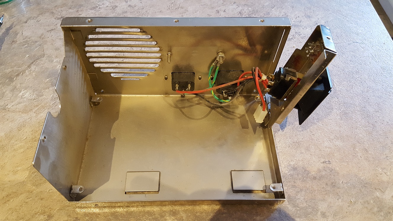 And now (left) de-soldered from its mains lead socket - the white lead is neutral and the black lead is live, attention is turned to the Seventeam PSU case with the old board removed (middle)