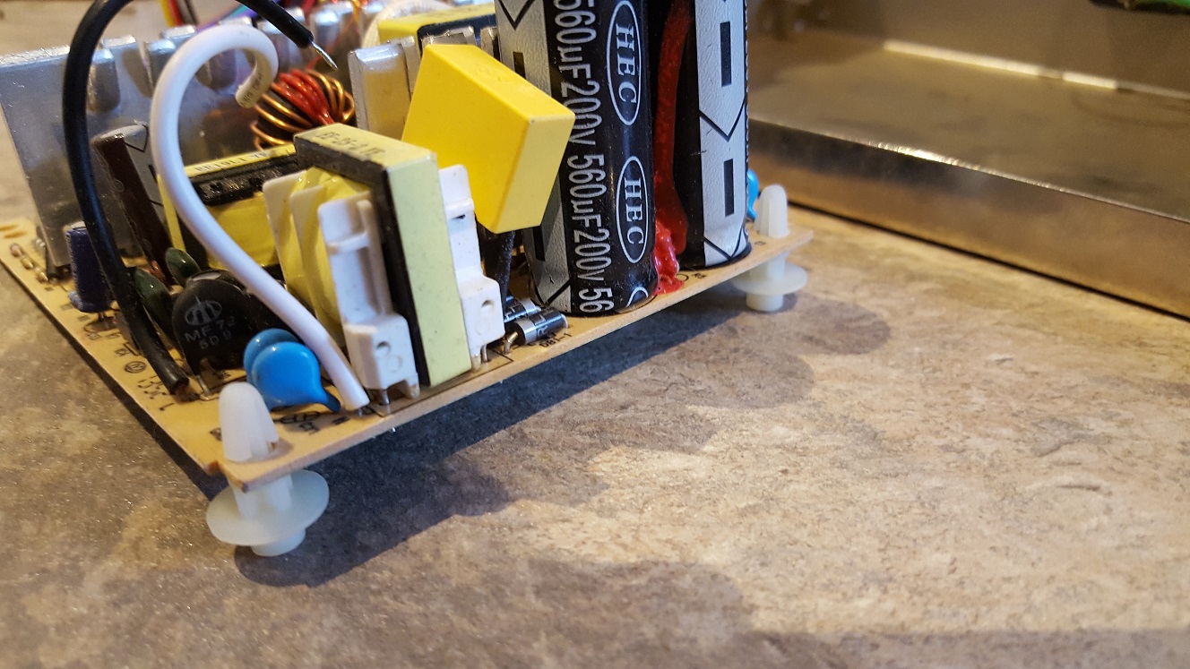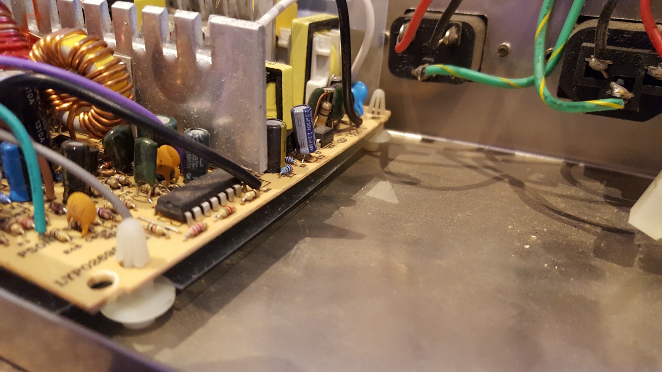 The CIT board is installed into the Seventeam power supply case, and secured in place with two screws on the far left side using the existing mounting points, and the stand-offs plus the insulating plastic layer from the CIT power supply are used to ensure no contact with the bottom or rear of the case.