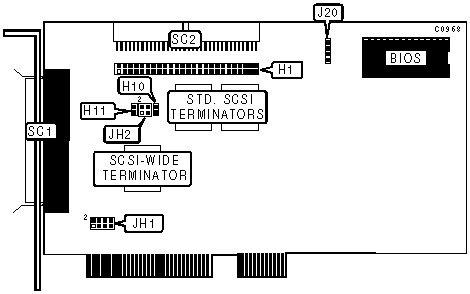 Note: Opening JH2/pins 1 & 2 enables standard SCSI terminators. Opening JH2/pins 3 & 4 enables
