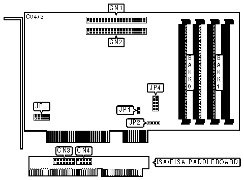 Some versions of this board have two 512KB x 8 DRAM chips mounted in place of Bank 0. In such a case the board will work without additional memory. In all other cases a pair of 256KB, 1MB, or 4MB SIMM modules must be installed in Bank 0 for the board to function. The optional ISA/EISA paddleboard solves the DC-690B incompatibility problem with some early PCI mainboards. If installed, connect CN3 to JP4, and set JP4/jumpers 1-4 in the open position. |