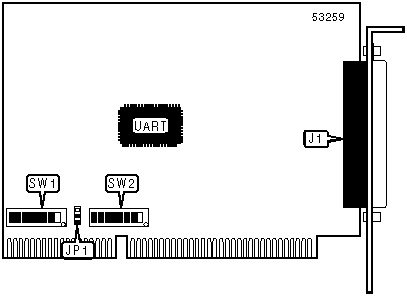 Note: A total of 512 base address settings are available. The switches are a binary representation of the decimal memory addresses. SW1/8 is the Most Significant Bit and switch SW1/1 is the Least Significant Bit. The switches have the following decimal values: SW1/8=4096, SW1/7=2048, SW1/6=1024, SW1/5=512, SW1/4=256, SW1/3=128, SW1/2=64, SW1/1=32. Turn off the switches and add the values of the switches that are off to obtain the correct memory address. (Off=1, On=0)