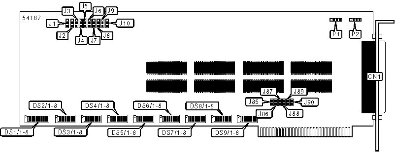 Note: A total of 128 base address settings are available. The switches are a binary representation of the decimal memory addresses. DS8/1 is the Most Significant Bit and switch DS8/7 is the Least Significant Bit. The switches have the following decimal values:DS8/1=512, DS8/2=256, DS8/3=128, DS8/4=64, DS8/5=32, DS8/6=16, DS8/7=8. Turn off the switches and add the values of the switches to obtain the correct memory address. (Off=1, On=0) |