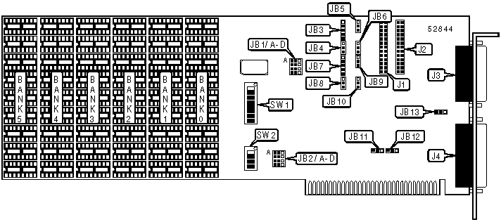 Note:Jumpers JB3 through JB10 are used for shorting or swapping serial port signals. JB3 through JB6 are for port 1, and JB7 through JB10 are for port 2. Defaults shown are for standard DTE setting. Other configurations are unidentified. | |||