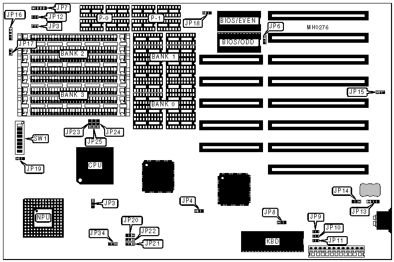 Note:SW1/switch 5 should be open if 1MB is installed, if memory is greater it should be closed. SW1/switch 4 should be closed if 10MB is installed. SW1/switch 3 should be closed if 4MB is installed. JP20 pins 1 & 2 must be closed if 4M x 9 SIMMs are used. | |||