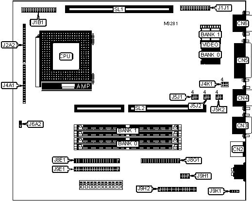 Floppy drive interface, IDE interfaces (2), parallel port, PS/2 mouse port, serial ports (2), 8514 video pass through connector, VGA port, VRM connector, cache slot, riser slot, wavetable connector MIDI/sound port connector |