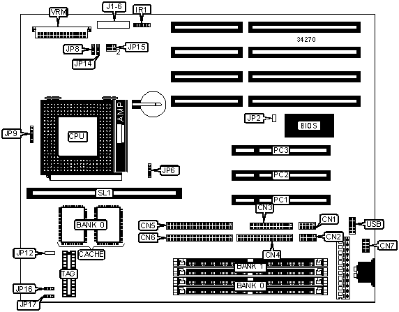 32-bit PCI slots (3), floppy drive interface, green PC connector, IDE interfaces (2), parallel port, PS/2 mouse interface, serial ports (2), cache slot, IR connector, VRM connector, USB connector |