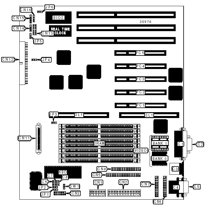 32-bit PCI slots (5), green PC connector, floppy drive interface, IDE interface, SCSI interface, SCSI-2 interface, parallel port, PS/2 mouse port, serial ports (2), VGA port, CPU slot |