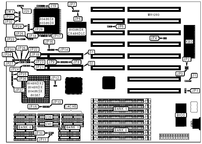 Note 1 :Jumper JP6 should be closed when a CX486DLC is installed, open for 80386DX.Note 2 :Jumper JP18 should be closed when a PGA cpu is installed, open for PQFP. | |||
