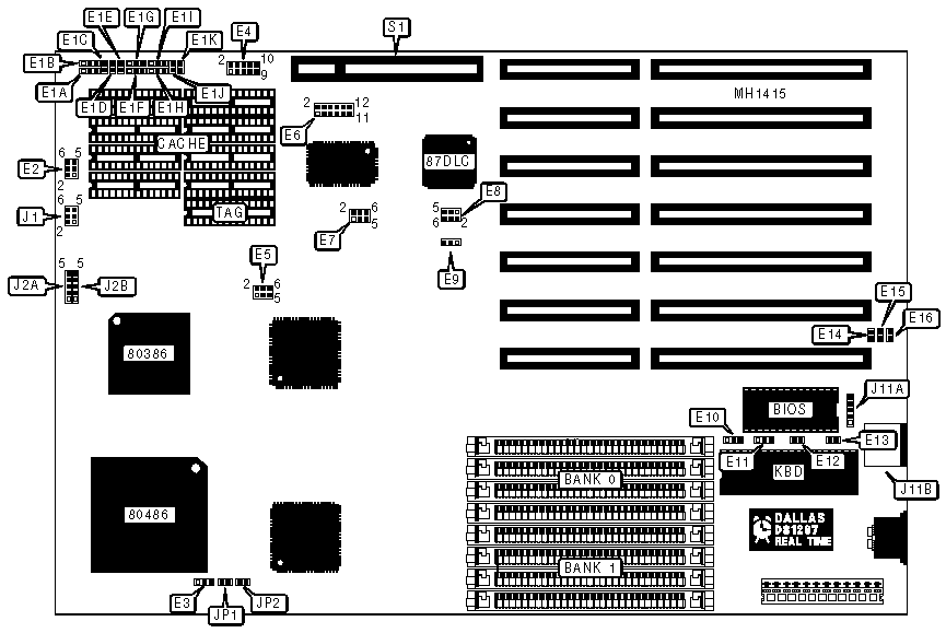 Notes: Pins indicated should be in the closed position. Early versions of the board (model DT-LB133) do not support the 80486 series processor. | ||||||