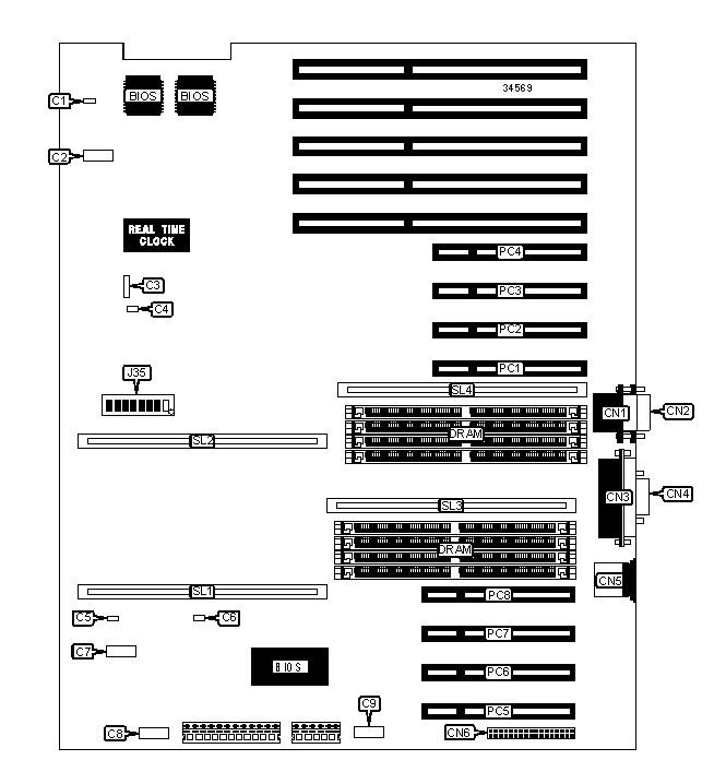 32-bit PCI slots (8), floppy drive interface, parallel port, PS/2 mouse port, serial ports (2), VGA port, CPU card slots (2), memory slots (2)