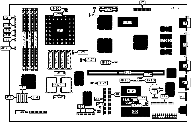 Floppy drive interface, green PC connector, IDE interfaces (2), parallel port, PS/2 mouse port, serial ports (2), VGA feature connector, VGA port, riser slot, wavetable connector, audio in CD-ROMs (3), MIDI connector |
