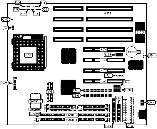Note: Board accepts EDO memory. If SDRAM DIMM with 64M-bit SDRAM is used on Bank 1 or Bank 2, Bank 0 must be empty. | |||