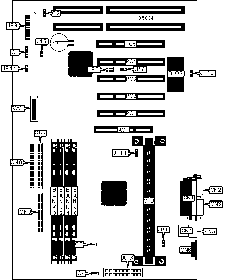 32-bit PCI slots (5), floppy drive interface, green PC connector, IDE interfaces (2), parallel port, PS/2 mouse port, serial ports (2), IR connector, USB connectors (2), ATX power connector, AGP slot, SB-link connector, wake on LAN connector