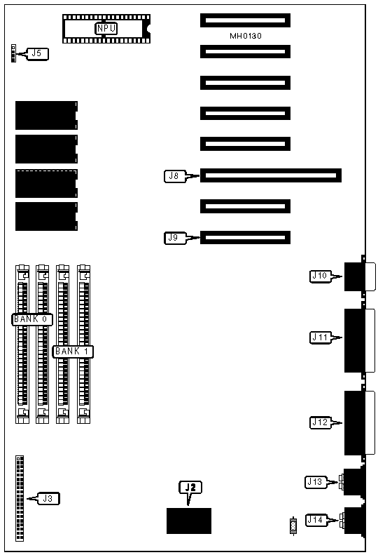 Serial port, parallel port, pointing device connector, video port floppy drive interface, hard drive interface slot, video expansion slot |