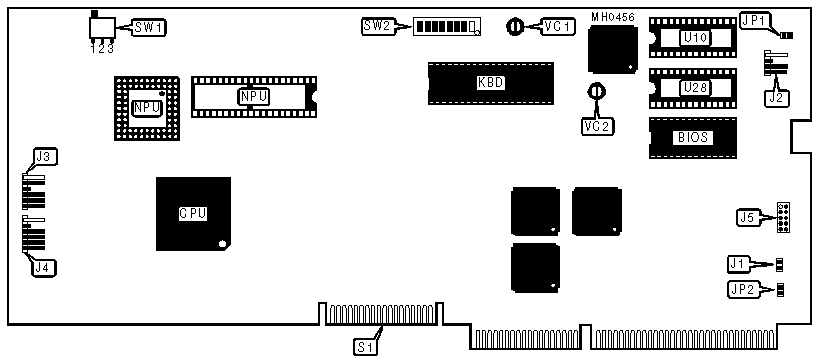 Notes:If JP2 is not present on main board, JP2 is factory set to open, if JP2 is present then JP2 is factory set to closed and should not be altered. Version B, main boards with part numbers of 150-0006935 and later, do not support the 80287. Location of 80287 NPU is unverified. On Version A main boards with part numbers of 150-0004426 or later, SW2/switch 3 controls video ROM caching and DMA is always in extended mode. If using a third-party video card, video ROM caching should be disabled. Variable capacitors VC1 and VC2 are present only on Version A main boards. | ||||