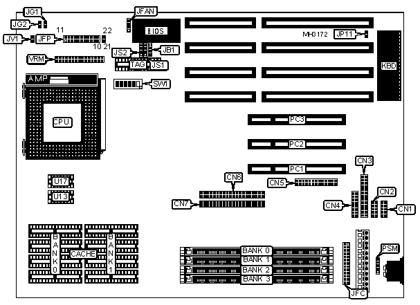 32-bit PCI slots (3), floppy drive interface, green PC connector, IDE interfaces (2), parallel port, PS/2 mouse interface, serial ports (2), VGA feature connector, VGA interface, VRM connector |