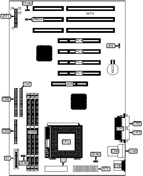32-bit PCI slots (4), floppy drive interface, green PC connector, IDE interfaces (2), parallel port, PS/2 mouse port, serial ports (2), USB connectors (2), ATX power connector, AGP slot |